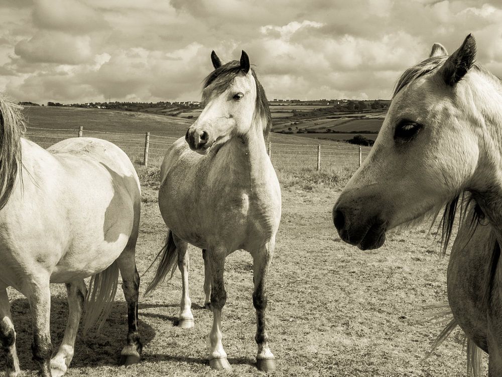 Pferde auf einer Weide, in Wales / Wolken / Grau / Schwarzweiß / Vintage / Fotografie / Kunst