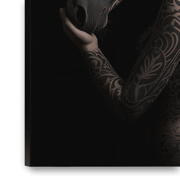 Schönes Kunstporträt einer Frau, die mit ihrem Pferd eins wird. Die Dame ist nackt und ihr Körper hat eine schöne Körperbemalung. Sie hat einen schönen dunklen Zopf wie einen Pferdeschwanz. In ihrer Hand hält sie den Pferdekopf, den sie wie eine Maske vor ihr Gesicht hält. Der Pferdekopf hat die gleiche Körperbemalung wie das Tattoo…