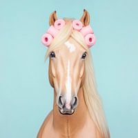 Mit einem Hauch von Glamour und einem zauberhaften Lächeln trägt dieses Pferd eine extravagant gestylte Mähne, geschmückt mit rosafarbenen Lockenwicklern. Die sanfte beige Farbe seines Fells harmoniert perfekt mit dem pastelblauen Hintergrund und verleiht dem Bild eine verspielte, nahezu magische Atmosphäre. Ein wahrhaft…