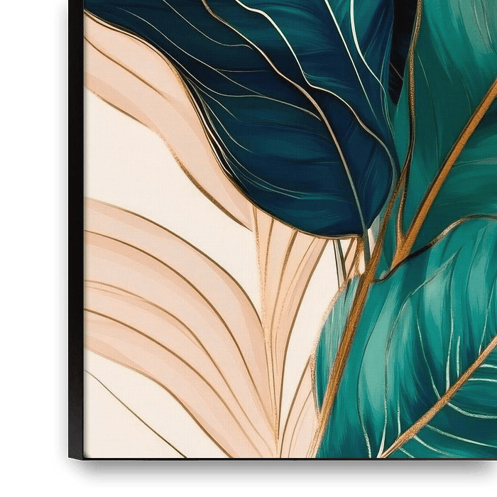 Ein lebhaftes Zusammenspiel von Farben entfaltet sich hier, wo kühles, tiefes Grün auf warmes Goldbraun trifft. Die filigranen Blätter tanzen wie eine sanfte Brise, während die schimmernden Adern den Kontrast zwischen Stärke und Eleganz betonen. Diese Komposition ruft das Gefühl tropischer Frische und zeitloser Schönheit hervor.