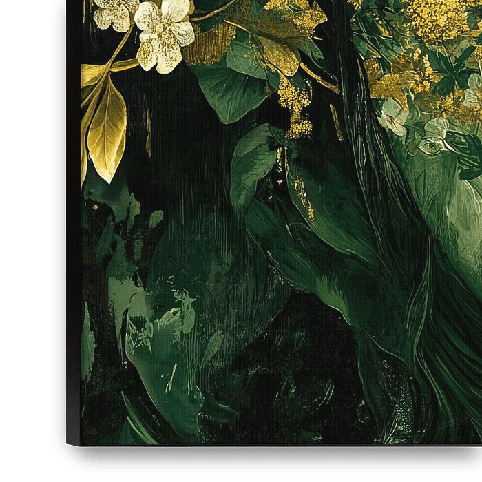 Pflanzengesicht | Grüne Fusion - Dieses botanische Gemälde zeigt ein weibliches Gesicht, das vollständig mit verschiedenen grünen Pflanzen und goldenen Blumen bedeckt und verschmolzen ist, wodurch eine lebendige und detaillierte Verschmelzung von Natur und Mensch entsteht.