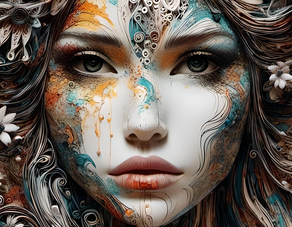 Eine weibliche Figur mit einer komplizierten floralen Kopfbedeckung ist mit sehr detaillierten Wirbeln und Mustern dargestellt, die sowohl an Haar als auch an Filigran erinnern. Ihr Gesicht ist mit kunstvollen Mustern verziert und ihre Augen vermitteln ein Gefühl von Tiefe und Emotion.