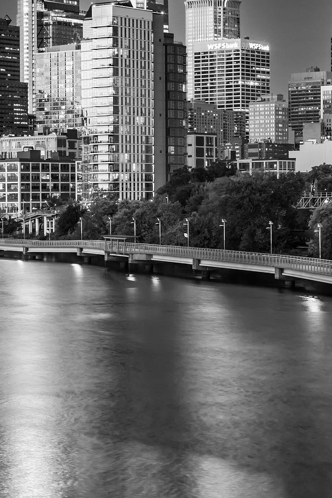 Entdecken Sie den atemberaubenden Ausblick von der South Street Bridge auf Downtown Philadelphia und den malerischen Schuylkill River Boardwalk! Diese Brücke bietet einen spektakulären Blick auf die beeindruckende Skyline der Stadt, die sich majestätisch über dem Schuylkill River erhebt. Klassische monochrome Impression.