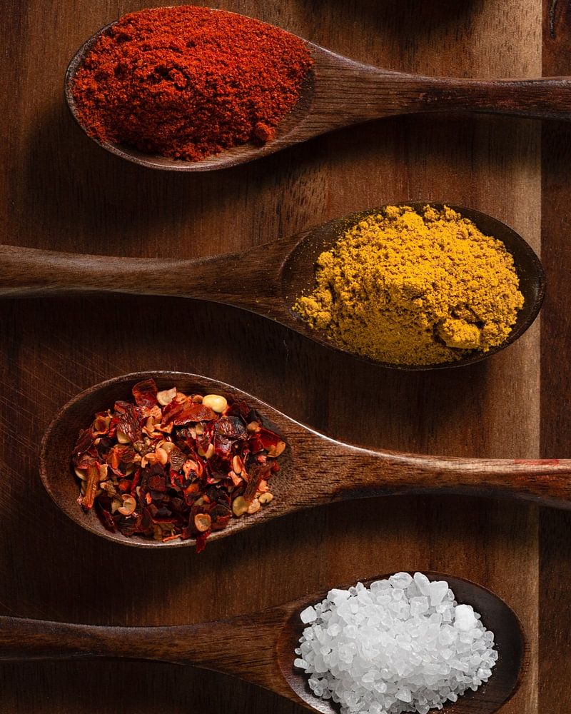 Gewürze und Kräuter - wir alle verwenden sie in der Küche, und sie verdienen es eigentlich, im Rampenlicht zu stehen. An der Küchenwand, zum Beispiel! Eine Auswahl an häufig verwendeten Gewürzen auf Holzlöffeln. Warme Töne, wärmende Gerichte.