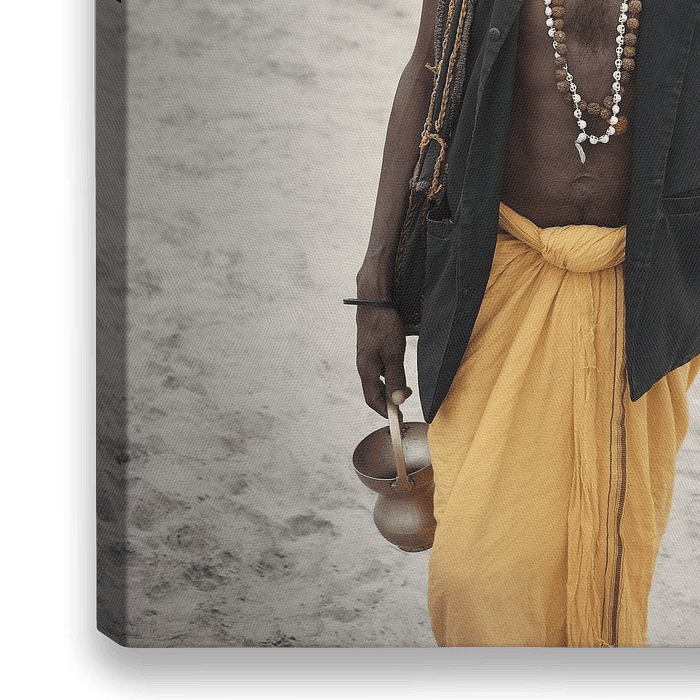 Pilger mit einem Stock in Allahabad. Heiliger Mann in Ganges in Indien. Hinduistische Rituale in Indien.