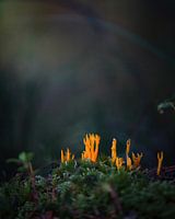 Der Pilz auf dem Bild ist als klebriger Korallenpilz bekannt und wird oft weniger als 5 cm groß. Der Pilz ist in Wäldern auf moosigem Boden und gefällten Baumstämmen zu finden.