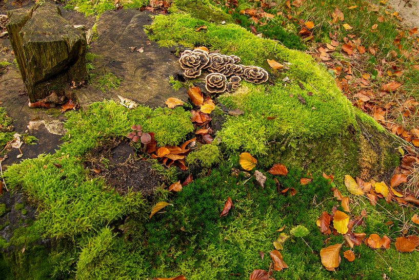 Die Pilze werden von den schönen warmen Farben des Mooses und der Herbstblätter eingerahmt.