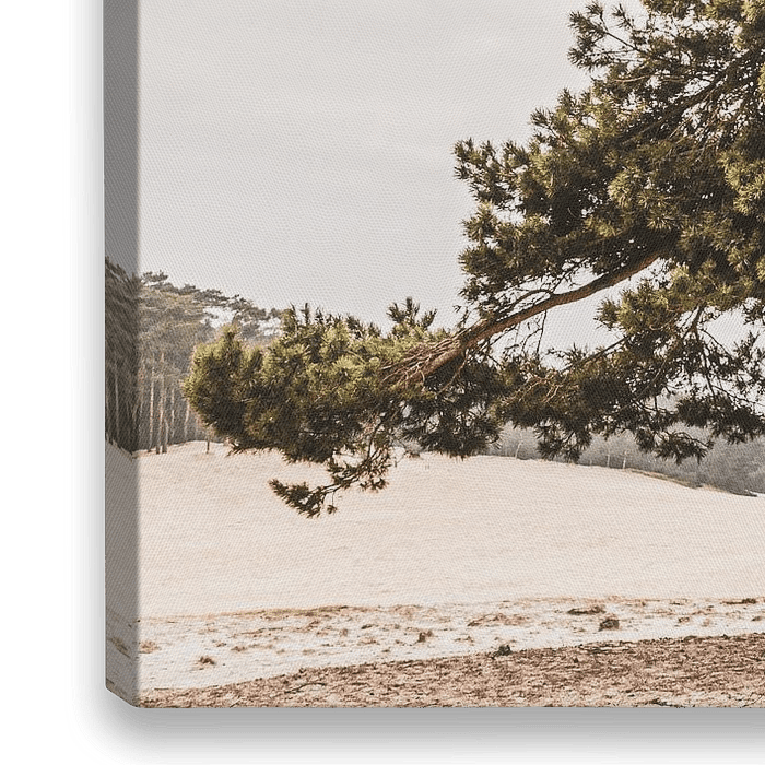 Eine skurril geformte Flugkiefer (auch Föhre genannt) mit oberirdischen Wurzeln auf einer Sandverwehung. Der ruhige, bewölkte Himmel lenkt die Aufmerksamkeit auf die grünen Nadeln und die charakteristische Baumform. Es ist ein nüchternes und kühnes Bild, das in viele Einrichtungsstile passt.