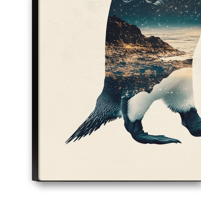 Ein majestätischer Pinguin, in den sanften Farben der Natur eingebettet, vereint in sich die Schönheit von schimmerndem Wasser und majestätischen Bergen. Diese harmonische Komposition strahlt Ruhe und Gelassenheit aus und bringt den Zauber der Natur ins Wohnzimmer, wo sie Herzen und Sinne gleichermaßen erfreut. Ideal für Naturliebhaber und Kreative!