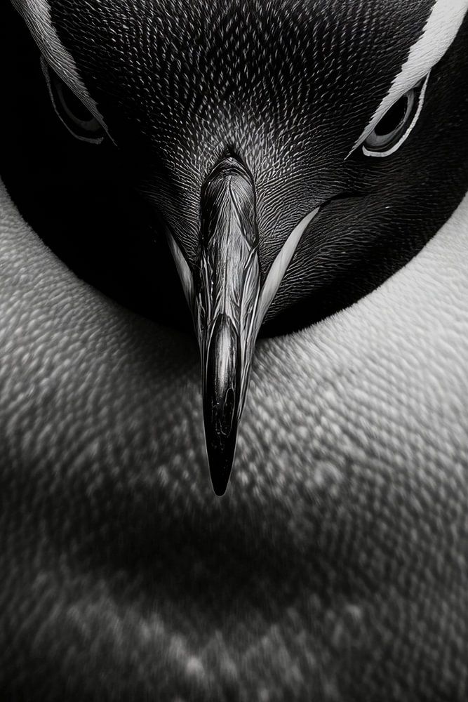 Ein majestätischer Pinguin mit durchdringendem Blick und eleganter Zeichnung entfaltet seine Präsenz in kraftvollem Schwarz-Weiß. Die faszinierende Textur seines Gefieders und die Konzentration seiner Mimik verleihen dem Raum eine einzigartige, kühle Eleganz. Ideal für ein modernes Wohnzimmer, wo er Gesprächsstoff und Bewunderung weckt.