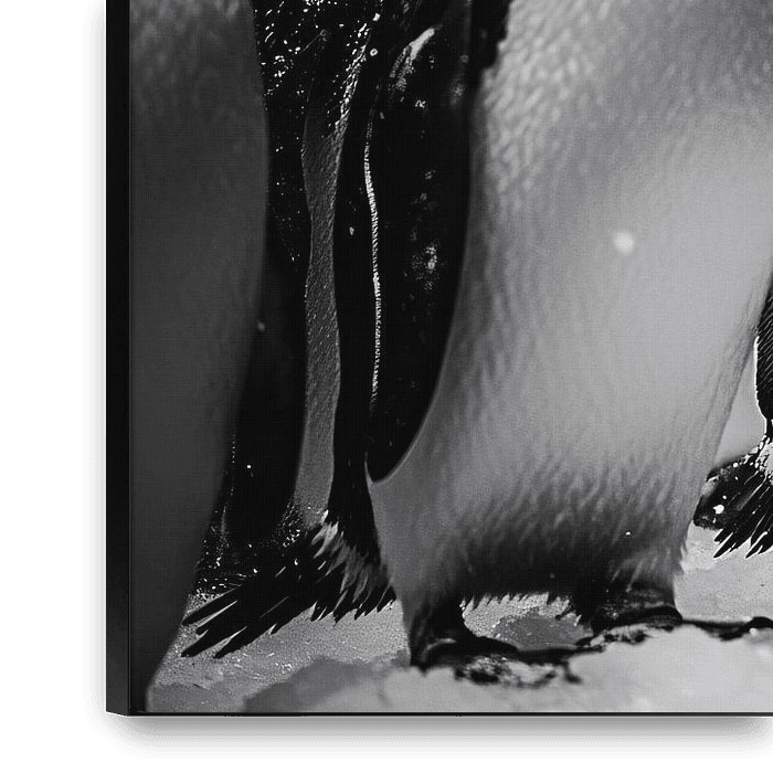 Dieses schöne Bild zeigt eine Gruppe von Pinguinen, die inmitten eines Schneesturms dicht beieinander stehen. Die schwarzen und weißen Farben und die natürliche Schönheit dieser Tiere werden in einem realistischen Stil hervorgehoben, der perfekt in ein modernes oder minimalistisches Interieur passt. Das Bild strahlt Kälte und…