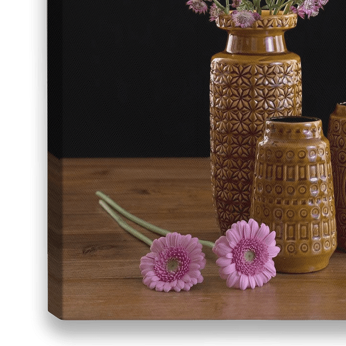 Rosa Blumen in und neben drei Vintage-Vasen. Diese Retro-Vasen aus den 70er Jahren sind beliebte Sammlerstücke und passen auch heute noch wunderbar in jedes Interieur. Die Vasen werden als "westdeutsche" Keramik bezeichnet, d. h. sie werden in Deutschland hergestellt.