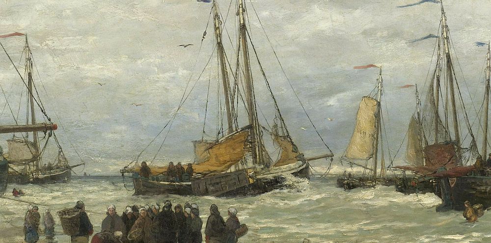 Mesdag war fasziniert vom Meer, den Fischern und ihren "kleinen Ziegen". Diese Schiffe hatten einen flachen Boden, so dass sie leicht am Strand segeln konnten. Pinken in de branding steht für den Zeitpunkt, an dem der frische Fang verteilt wird. Durch das breite Format und die großen Pinselstriche hat Mesdag eine alltägliche Szene zu einer monumentalen Komposition erhoben. Mesdag machte seine Vorstudien vor Ort in Scheveningen, seine Bilder im Atelier.