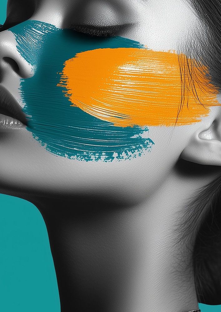 Eine Schwarz-Weiß-Fotografie einer eleganten Frau mit subtilen Pinselstrichen in Teal und Gelb auf ihrem Gesicht, ausgeführt in einem minimalistischen Stil. Hinter ihrem Kopf befindet sich ein sanfter tealfarbener Kreis, der der Komposition ein beruhigendes Gleichgewicht und ein raffiniertes Aussehen verleiht. Die Kombination der monochromen Fotografie mit den leuchtenden Farben der Pinselstriche und des Kreises schafft einen modernen Kontrast und unterstreicht sowohl die Einfachheit als auch den Charakter dieser stilvollen Bildkomposition.