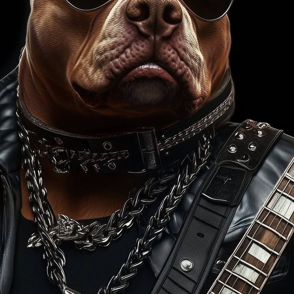 Das Pitbull Rockstar mit Gitarre Porträtgemälde ist ein kraftvolles und verspieltes Kunstwerk, das die rohe Energie des Rock 'n' Roll mit dem harten Look eines Pitbulls verbindet. Dieses einzigartige Porträt zeigt den Hund als wahren Bühnenhelden, komplett mit Lederjacke, Sonnenbrille und einer Gitarre.