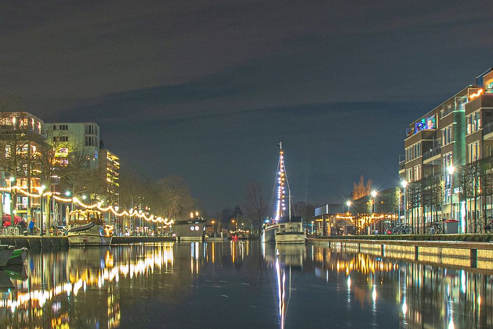 Der wunderschöne beleuchtete Piushaven Boulevard von Tilburg am Winterabend während des Piushaven-Glühens Datum: 29. Dezember 2019