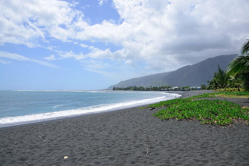 Plage de Taharuu, one of Tahiti's natural treasures on the island of Tahiti Nui in French Polynesia. Taharuu Beach is on Tahiti's southern coast in Papara, characterized by its volcanic black sands, leafy green palm trees and its width.