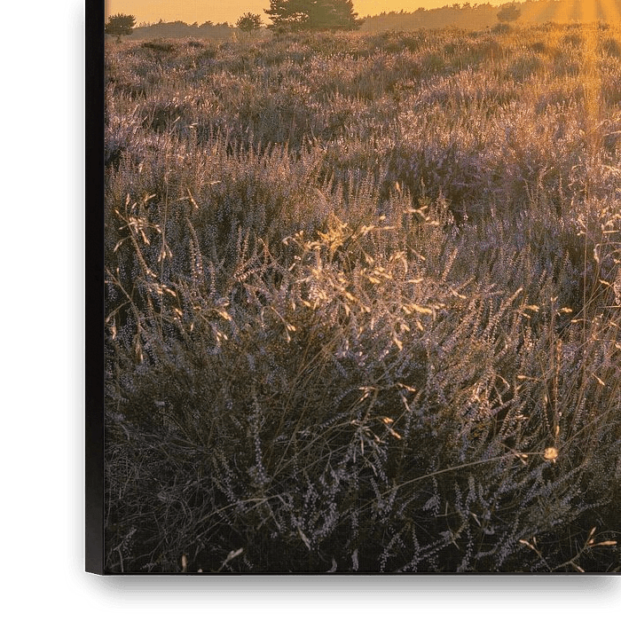 Porträt des Naturschutzgebiets Planken Wambuis in Ede, Gelderland, mit blühenden Heidekrautpflanzen im Vordergrund und der untergehenden Sonne im Hintergrund