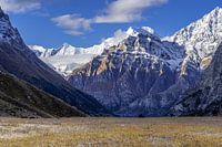 Himalaya-Plateau. Grasebene mit schneebedeckten Gipfeln im Hintergrund die Anapurna-Berge in Nepal.