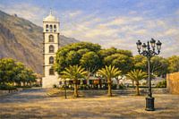 Dieses impressionistische Gemälde der Plaza de La Libertad in Garachico auf Teneriffa fängt die ruhige Atmosphäre des Platzes mit warmen Farbtönen ein. Links steht der weiße Glockenturm der Iglesia de Santa Ana, im Mittelpunkt sind Palmen und eine Terrasse zu sehen. Üppige Bäume und Palmen werfen tiefe Schatten auf den Platz, wo eine…