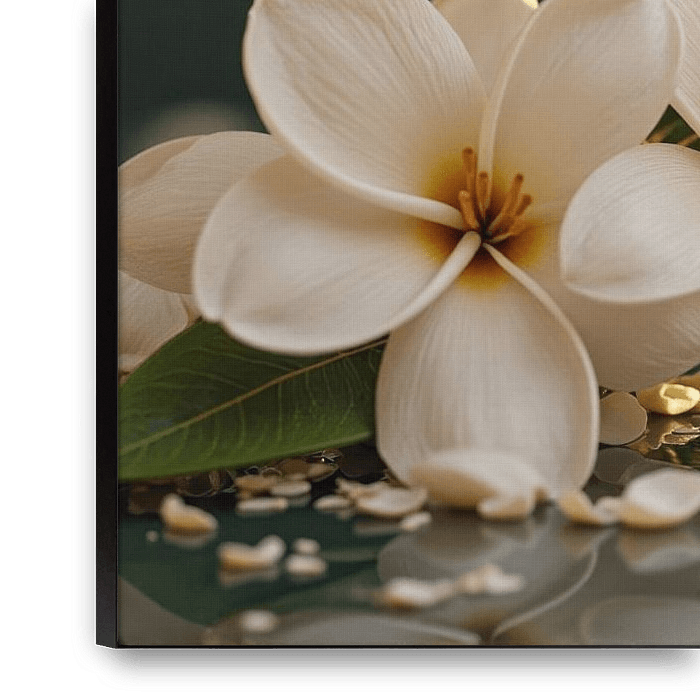 Nahaufnahme eines Büschels weißer Plumeriablüten mit grünen Blättern, die auf einer dunklen, mit abgefallenen Blütenblättern übersäten Fläche ruhen. Warmes Licht beleuchtet die Blüten.