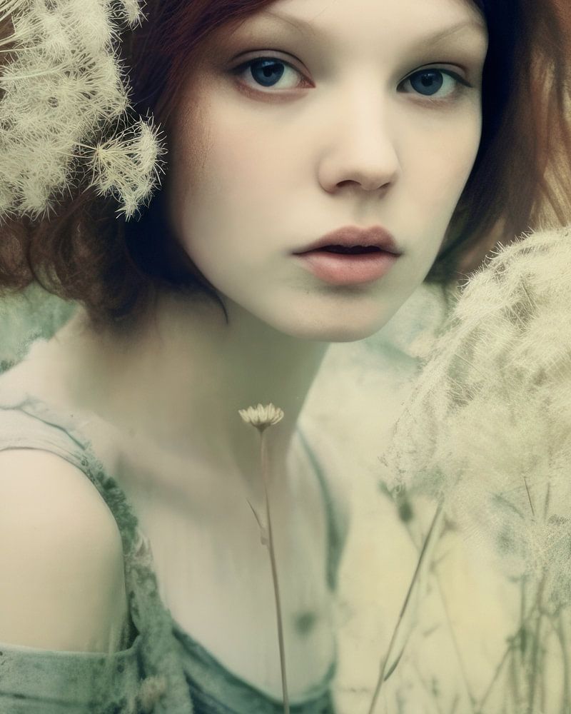Poetisches Porträt in matten Pastellfarben eines Mädchens in einem Blumenfeld zwischen Petersilie. Ein schönes Werk für Ihre Wand, schön in jeder Größe!