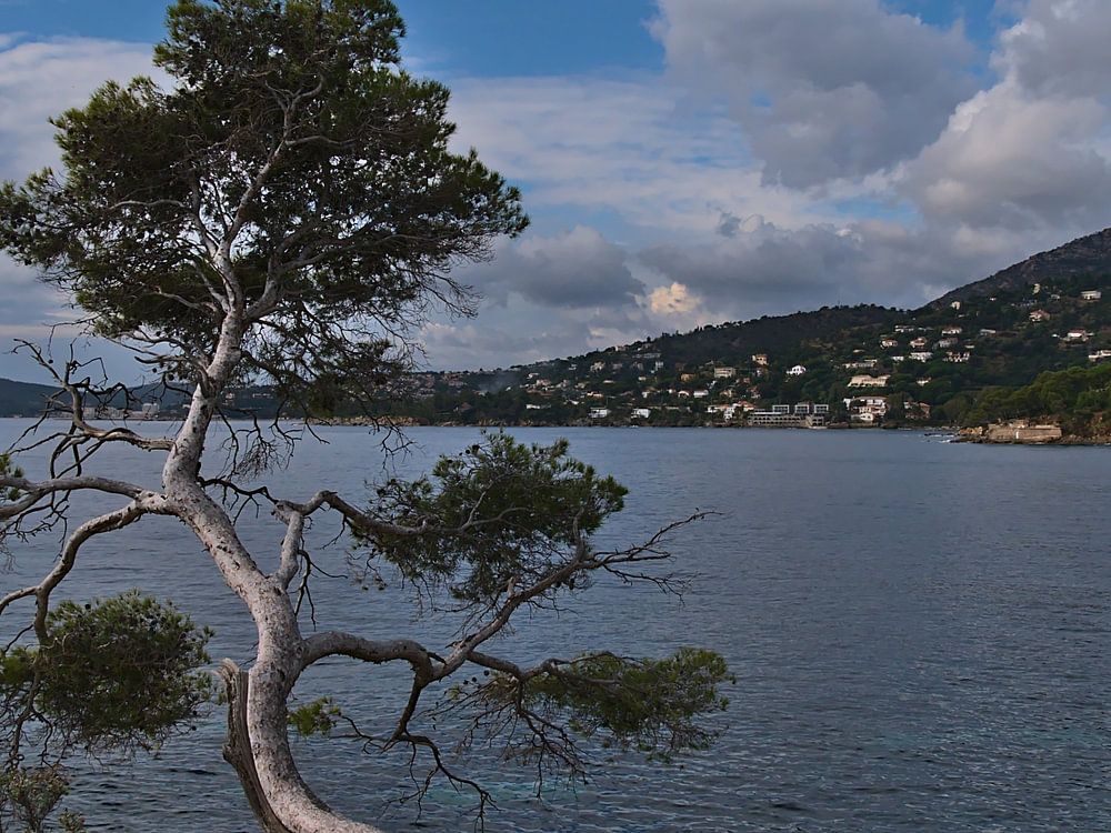Landschaftsaufnahme am Pointe du Layet bei der kleinen Stadt Le Lavandou an der Cote d'Azur im Süden von Frankreich mit einem einzelnen sich windenden Baum an einem wolkigen Tag im Herbst.