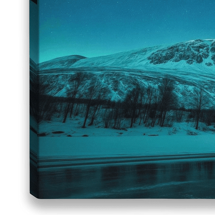 Bestelle dieses Landschafts-Wandbild Polarlichter über einer Winterlandschaft von Klaus Tesching - Art-AI als Reproduktion auf Leinwand, Alu-Dibond, als Poster, Fototapete oder Acrylglasbild.