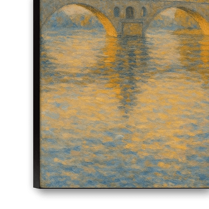 Dieses impressionistische Kunstwerk zeigt die historische Brücke Pont d'Avignon im Licht eines warmen, goldenen Sonnenuntergangs. In einer leuchtenden Palette aus sanften Gelbtönen, Pastellrosa und zarten Lavendeltönen gemalt, hebt die Szene die eleganten Bögen der Brücke hervor, die sich über den Fluss Rhône spannen. Das umgebende Wasser spiegelt den Himmel mit schimmernden Reflexen wider und verwandelt die Landschaft in einen harmonischen Tanz aus Farben und Licht, der an Monets atmosphärischen Stil erinnert.