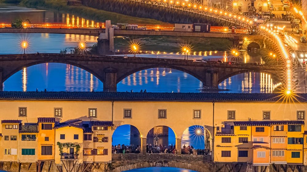 Ein 16:9-Foto, aufgenommen auf dem Piazzale Michelangelo an einem Abend nach Sonnenuntergang, das die berühmte Ponte Vecchio-Brücke zeigt. Die antike Brücke, die sich über den Fluss Arno in Florenz, Italien, beugt.