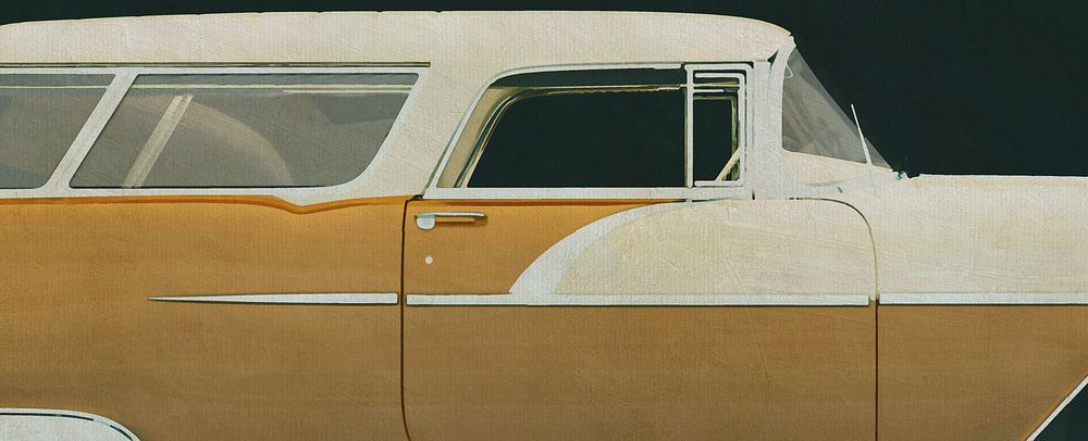 Dieses Gemälde eines Pontiac-Kombis aus dem Jahr 1956 kann sehr groß auf verschiedene Materialien gedruckt werden. Das Werk hat ein Panoramaverhältnis und eignet sich sehr gut, um in einem Arbeitsraum, Ausstellungsraum oder einfach zu Hause ein Detail hinzuzufügen, das Ihre Besucher beeindrucken wird.