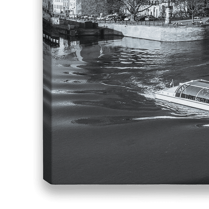 Schwarzweißfotografie Panorama Ausflugsboot auf dem Fluss Ill bei den Ponts Couverts (Gedeckte Brücke) in La Petite France oder auch Gerberviertel in Straßburg, Elsass, Frankreich