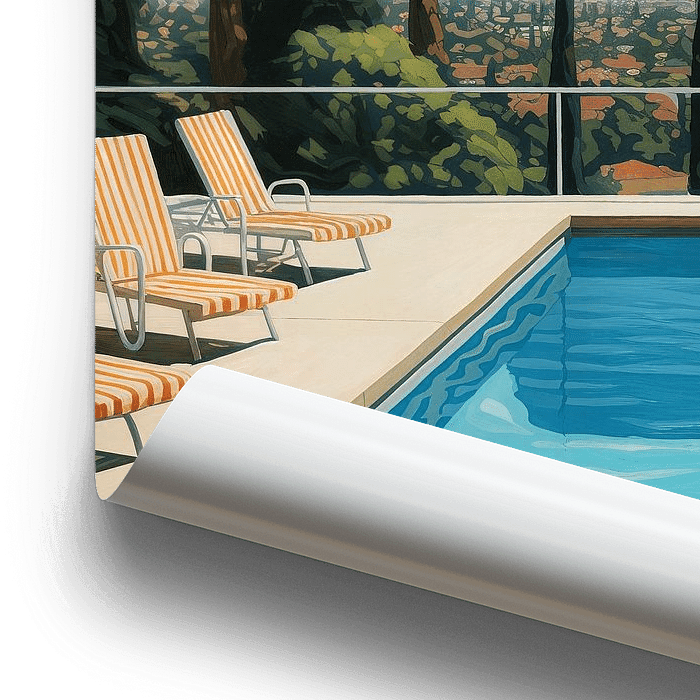 Ein digitales Kunstwerk vom Blick über einen Pool auf Berverly Hills und die Skyline von Los Angeles, das wie ein Gemälde wirkt.