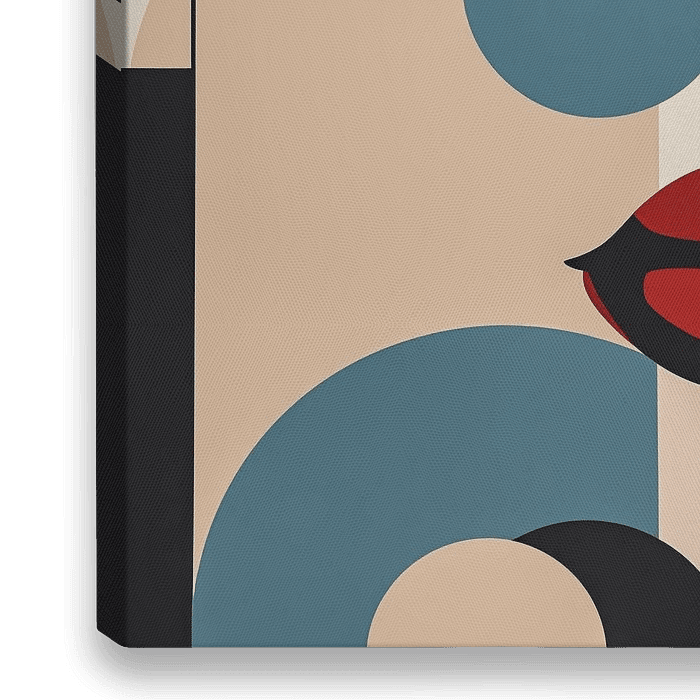 Dieses Gemälde ist ein fesselndes Beispiel für Pop Art, das durch seine markanten geometrischen Formen und leuchtenden Farben besticht. Die stilisierte Darstellung eines weiblichen Gesichts, akzentuiert durch kräftige rote Lippen und geschlossene Augen, schafft eine Balance zwischen Abstraktion und Eleganz. Die Verwendung von Kreisen,…