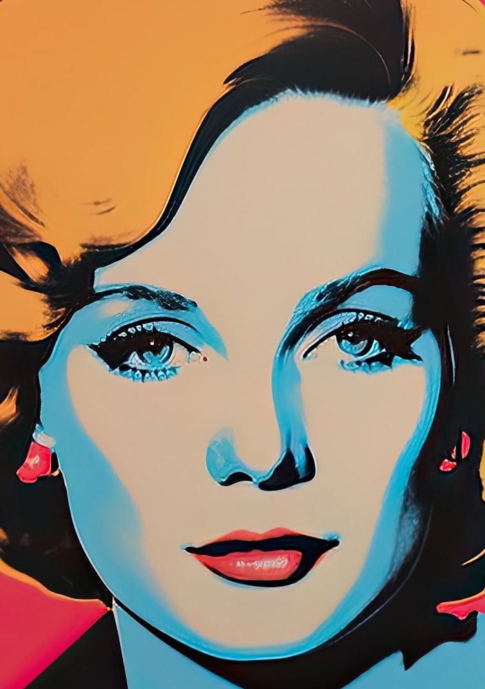 Ein Pop Art Werk, intensiver Blick, Hellorange und Schwarz, Lithographie, würdevolle Posen, Magenta, malerisch