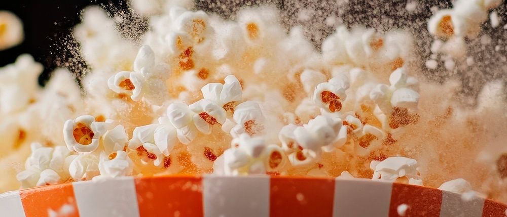 Ein sprudelndes Schauspiel aus fluffigem Popcorn, das förmlich aus seiner bunten Schale springt und sich kunstvoll in die Luft erhebt. Die lebhaften orange-weißen Streifen strahlen Freude und Geselligkeit aus. Perfekt für das Wohnzimmer, um die Vorfreude auf einen Filmabend zu wecken und eine einladende Atmosphäre zu schaffen.