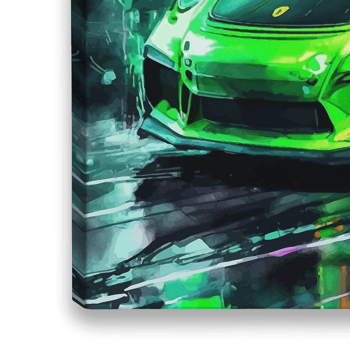 Bestelle diese Malerei Porsche 911 GT3 RS Grün Neon von MIROKKU als Reproduktion auf Leinwand, Alu-Dibond, als Poster, Fototapete oder Acrylglasbild.