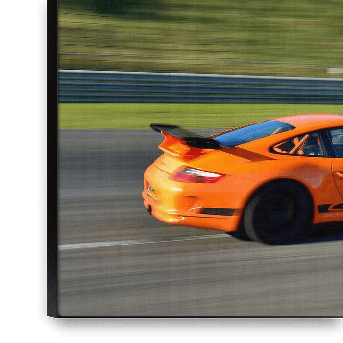 Porsche 911 GT3 RS auf der Rennstrecke in Zandvoort fährt mit hoher Geschwindigkeit in Richtung Tarzan-Kurve. Bild mit viel Bewegungsunschärfe.