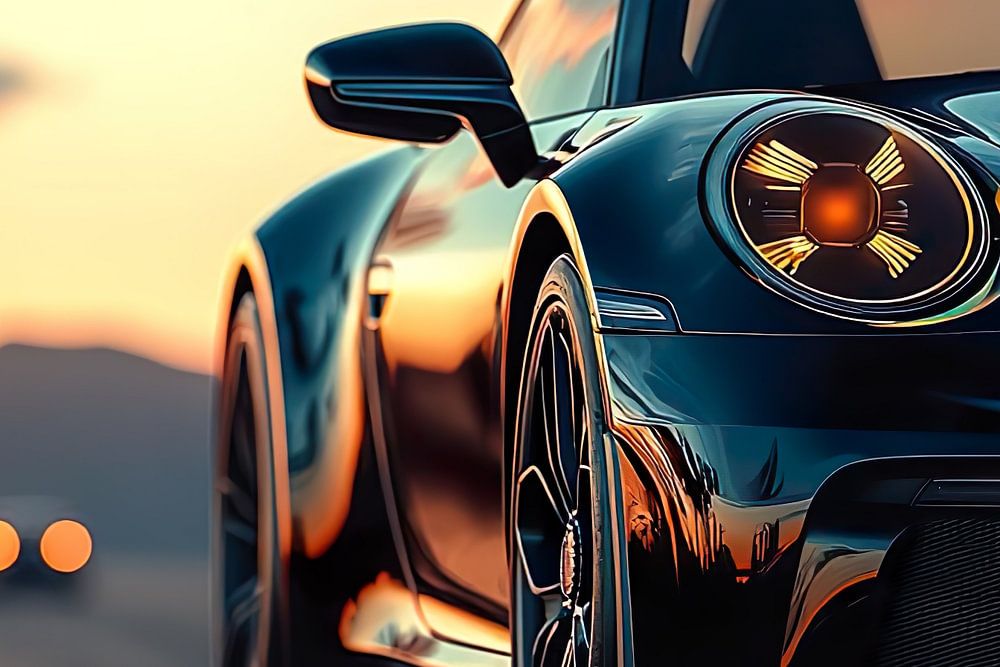 Ein Porsche 911 GT3 rast durch die weite amerikanische Landschaft, entlang der endlosen geraden Straßen des Wüstensüdwestens, wo rote Felsformationen und Kakteen den Horizont beherrschen. Der glänzende Sportwagen wirbelt Staub auf, während er über menschenleere Highways rast, sein Motor röhrt tief und kraftvoll. Unter freiem Himmel, wo die Sonne tief am Horizont steht, kontrastiert die moderne Schönheit des GT3 perfekt mit der rauen, wilden Landschaft Amerikas.