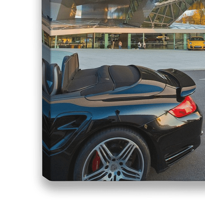Porsche 911 Cabrio vor dem Porsche Museum, Architekt Delugan Meissl, in Stuttgart-Zuffenhausen, Stuttgart, Deutschland.