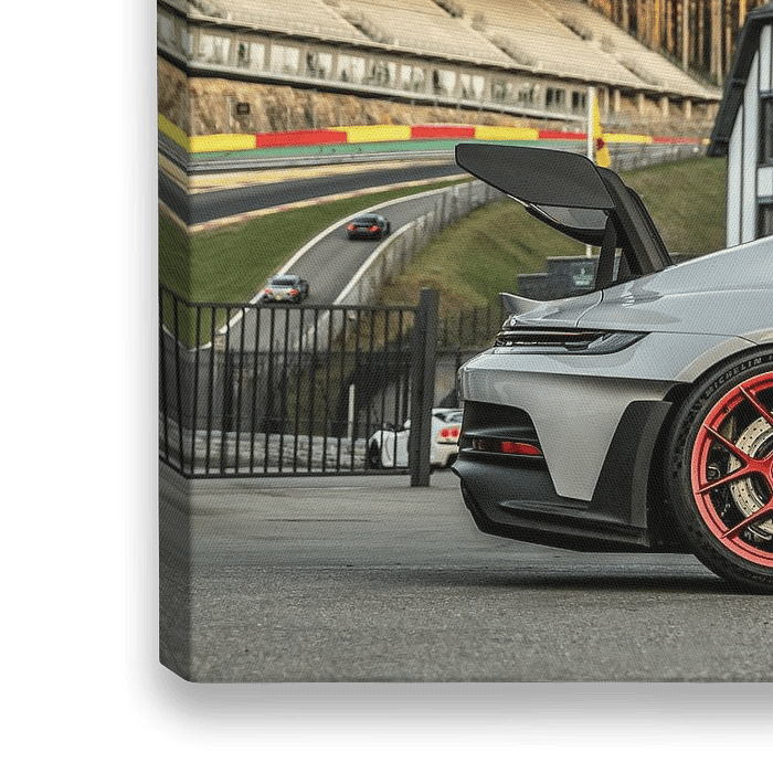 Der neueste Porsche 911 / 992 GT3 RS auf der Rennstrecke von Spa-Francorchamps. Mit den berühmtesten Kurven der Strecke, Eau Rouge und Raidillon, im Hintergrund.