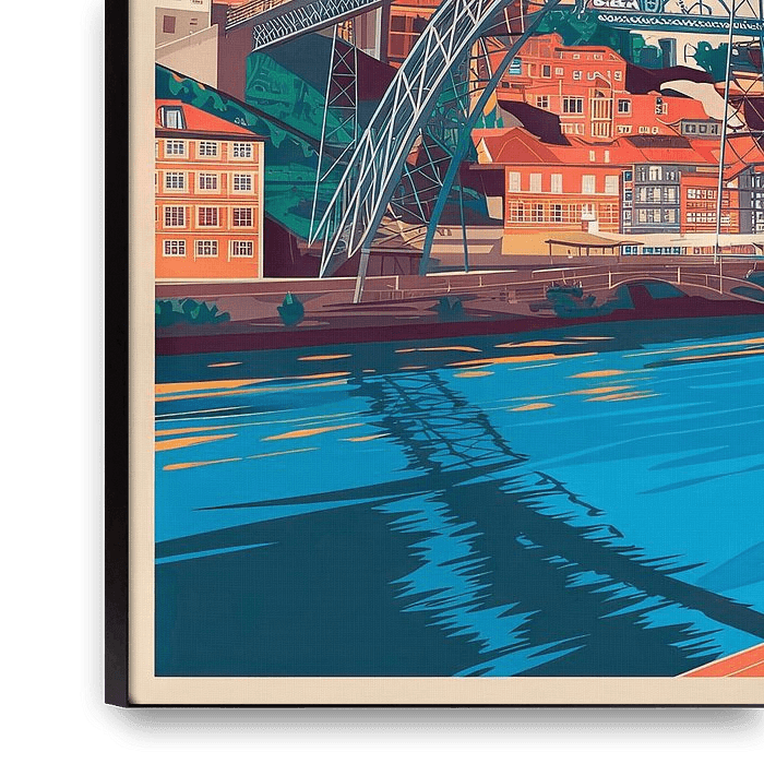 Ein faszinierendes Zusammenspiel von Farben und Formen entführt den Betrachter nach Porto. Die majestätische Brücke, die sich über den glitzernden Fluss spannt, vereint modernistische Architektur mit der historischen Kulisse der Stadt. Die warmen Töne der Gebäude verleihen dieser lebhaften Szene einen einladenden Charakter, während der…