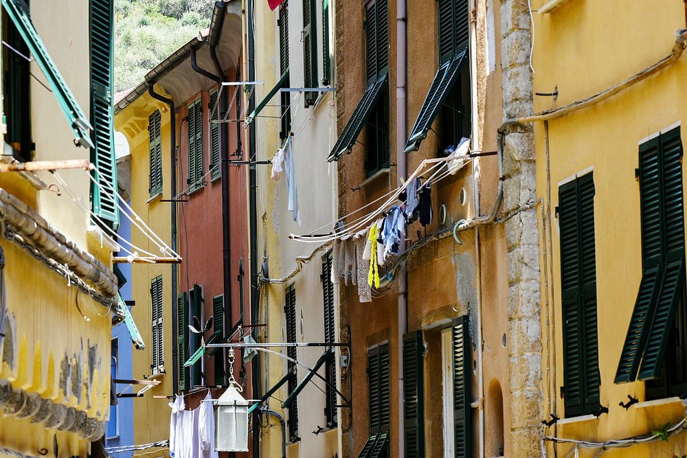 Porto Venere in Italien, typische enge Altstadtstraße mit bunten Häusern und Wäscheleinen, ausgewählter Fokus, geringe Tiefenschärfe