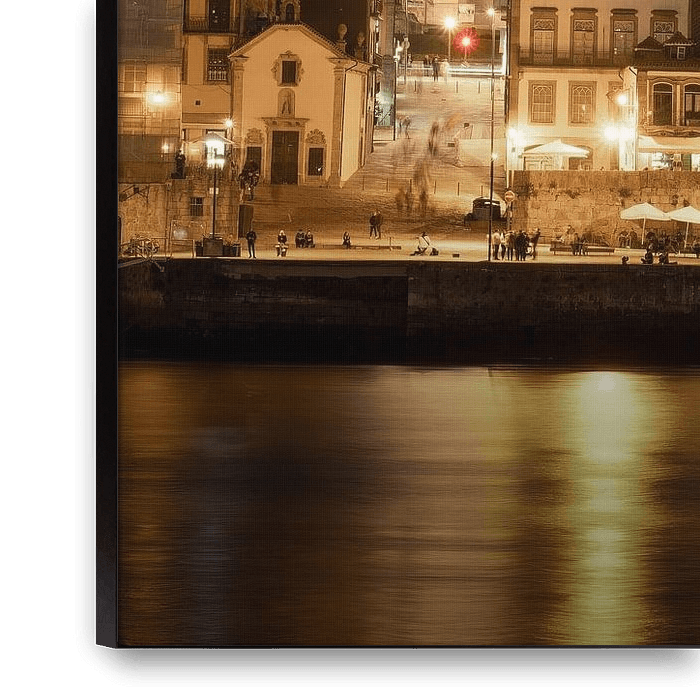 Die Altstadt von Porto mit ihren beleuchteten Fenstern am Hafen zeigt die Lebendigkeit dieser faszinierenden Stadt, die auch Abend und Nacht beherrscht. Das Licht der Laternen und Häuser spiegelt sich im Wasser des Duero.