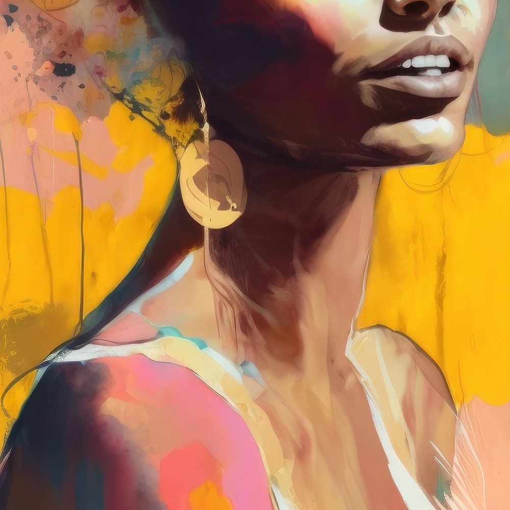 Buntes und fröhliches Porträt einer jungen Frau mit dem Titel: "Cover me in sunshine". Sommerliche Akzente machen dieses Werk zu einem besonderen Stück für Ihre Wand, das Sie aufheitern wird!