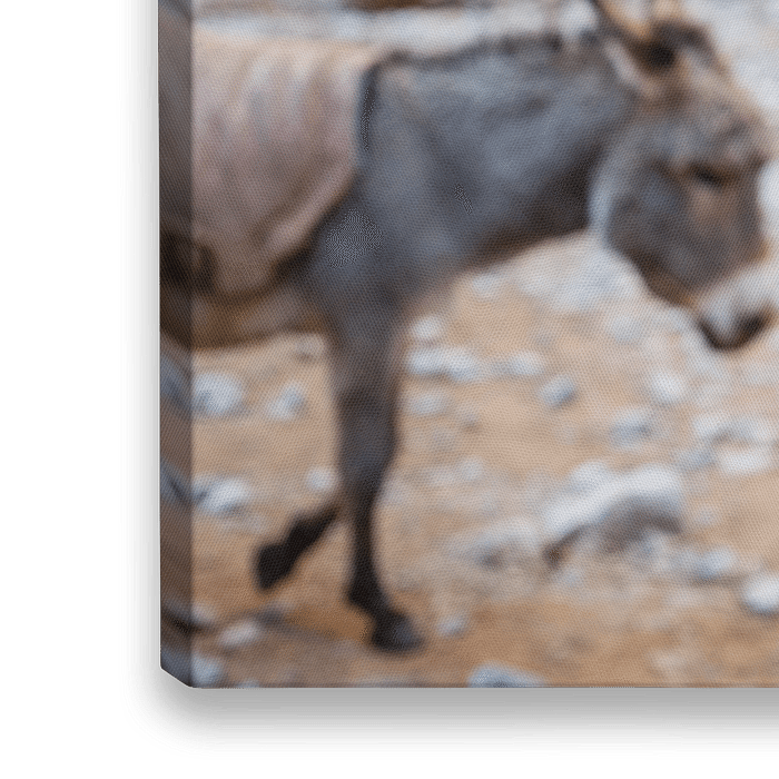 Porträt einer Berbermutter mit ihrem Sohn auf dem Rücken. Bunte Kleidung und ein Esel im Hintergrund.