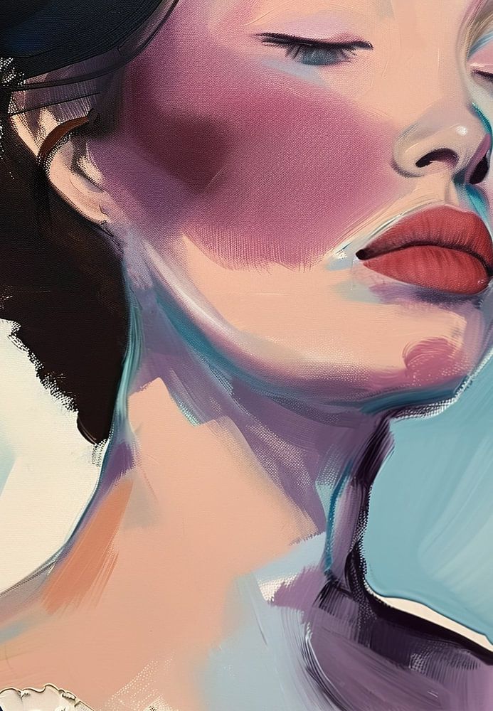 Porträt einer schlafenden Frau. Abstraktes Gemälde aufgrund des locker gemalten Hintergrunds und des gestreiften Gewandes, das als Kleid getarnt ist. Suggestiv geschwungene Formen. Ein farbenfrohes Gemälde in den sich ergänzenden Farben Lila, Blau, Grün, Braun, Beige, Weiß und Schwarz. Passend zu verschiedenen Stilen und Trends. Abstrakt modern.