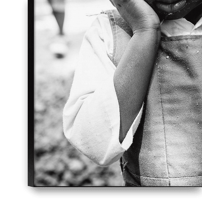 Schwarz-Weiß-Porträt eines Mädchens aus Gambia, Afrika. Große Augen starren in die Linse, die Hände schüchtern an die Wangen gelehnt.