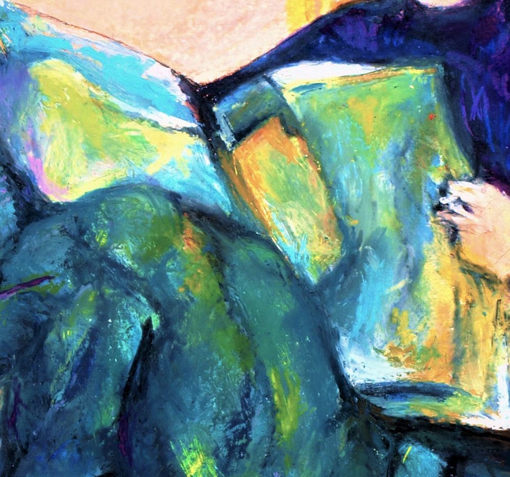 Figuratives impressionistisches Porträt einer lesenden Frau, gemalt mit Ölpastell. Die dunklen Farben ihrer Kleidung heben sich von dem hellen Hintergrund ab. Sie sitzt mit angezogenen Beinen auf dem dunkelblauen Boden und stützt sich auf einen Stapel Bücher. Ihr dunkelblauer lila-grüner Rock fällt in Falten über ihre Beine. Das Licht der Lampe hinter ihr fällt auf die Zeitung. Es ist ein ruhiges, atmosphärisches Gemälde. Passt gut in klassische, aber auch in moderne Interieurs.