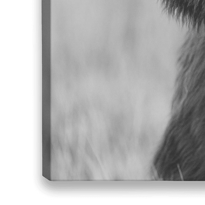 Foto eines schottischen Hochländers, in schwarz-weiß. Der schottische Highlander wurde von vorne fotografiert. So dass der Kopf gerade von vorne zu sehen ist. Der Blick ist neugierig und freundlich. Die Hörner ragen nach oben. Oben auf dem Kopf stehen die Haare stolz im Wind. Die Ohren sind behaart, und die Ohrmarke ist nicht sichtbar.…